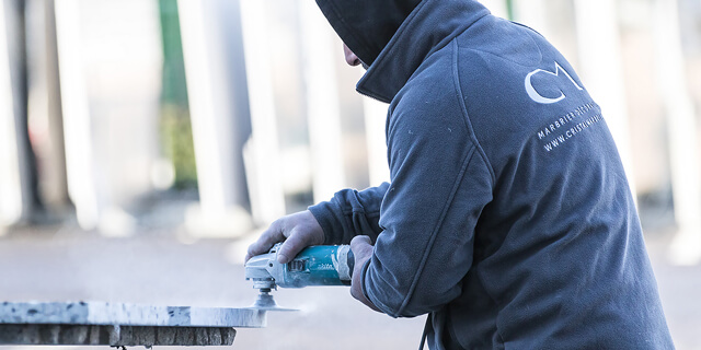 Une fois votre plan de travail, vasque ou dallage découpé, il est façonné dans la forme et la finition voulue : arrondis, angle, incurvation…
